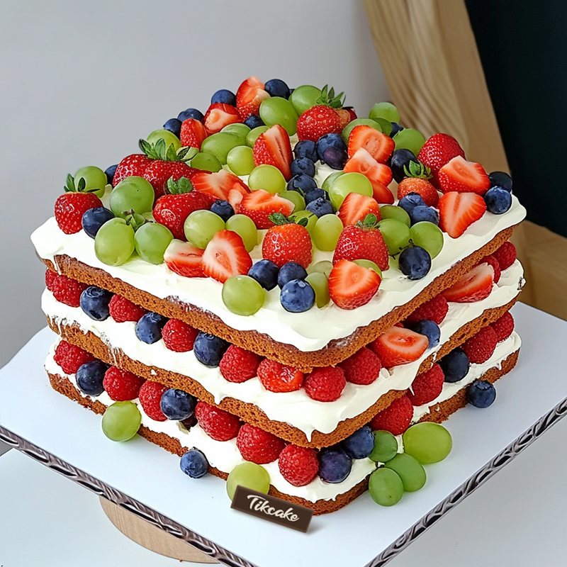 内层蛋糕胚 奶油(含水果果肉)叠加,表层奶油、水果等装饰