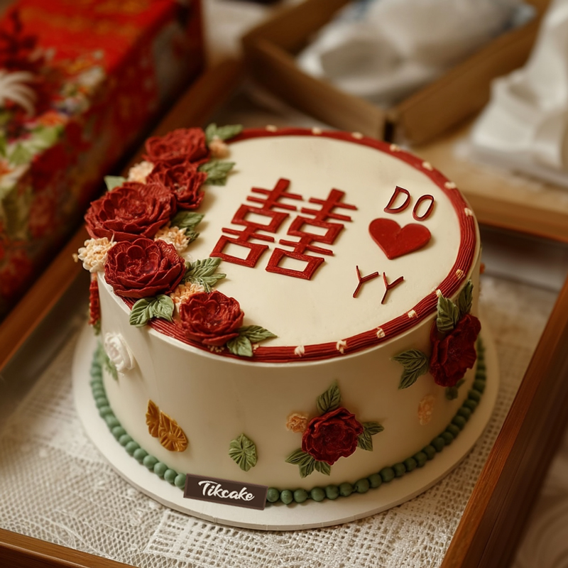 原创婚庆主题翻糖鲜奶蛋糕(含6个纸杯蛋糕)